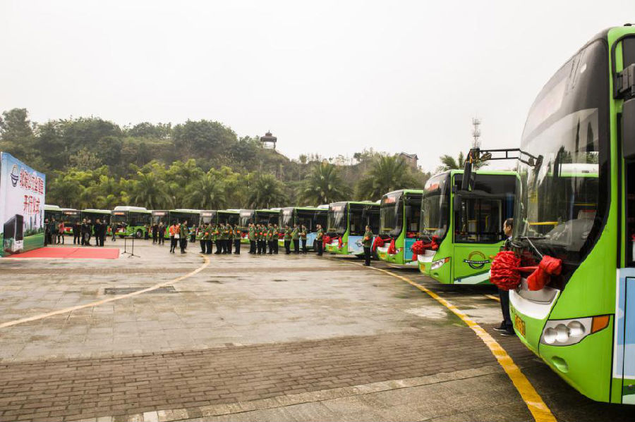 11月30日上午,北碚公交全覆蓋開(kāi)行儀式在北碚臺(tái)農(nóng)園公交站隆重舉行,40臺(tái)佩戴著大紅花的嶄新公交車(chē)整齊劃一,整裝待發(fā)。