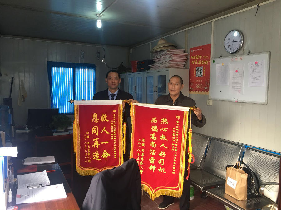 21日上午9點(diǎn),巴南區(qū)木洞鎮(zhèn)居民陳健、田厚芬夫妻2人帶著錦旗來(lái)到東城公交輕紡城調(diào)度室,專(zhuān)程感謝東城公交925路駕駛員騰文紅的救命之恩。
