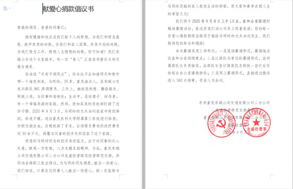 馬明玲是重慶東城公交公司龍盛經(jīng)營部龍興路隊(duì)981路一名普通的調(diào)度員。當(dāng)?shù)弥恼煞蛴鄤⑼话l(fā)腦溢血,后續(xù)醫(yī)療費(fèi)用困難,龍盛經(jīng)營部立即發(fā)起了為員工患病家屬捐款的獻(xiàn)愛心活動(dòng)。