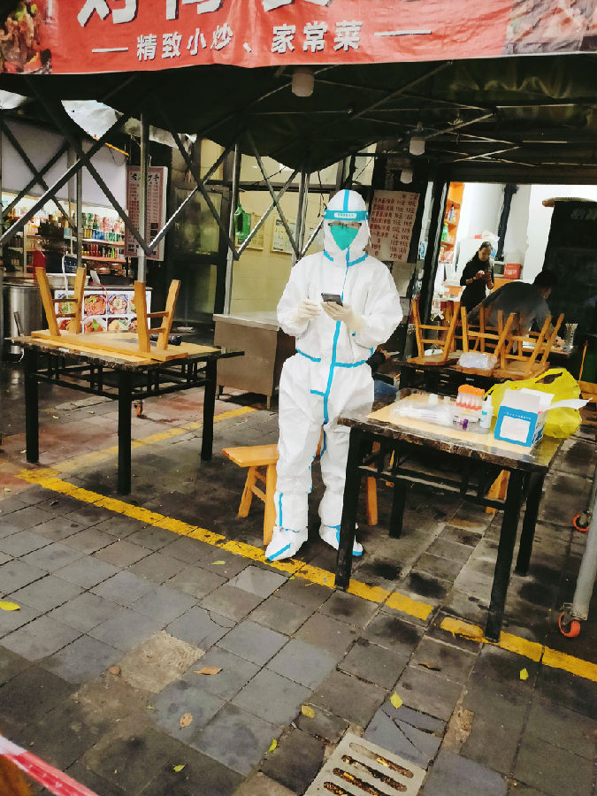 東城公交龍盛經(jīng)營部潘曉妍,負(fù)責(zé)小區(qū)內(nèi)居民檢測核酸的秩序維護(hù)及核酸掃碼工作, 以實(shí)際行動展現(xiàn)了黨員的責(zé)任與擔(dān)當(dāng)。