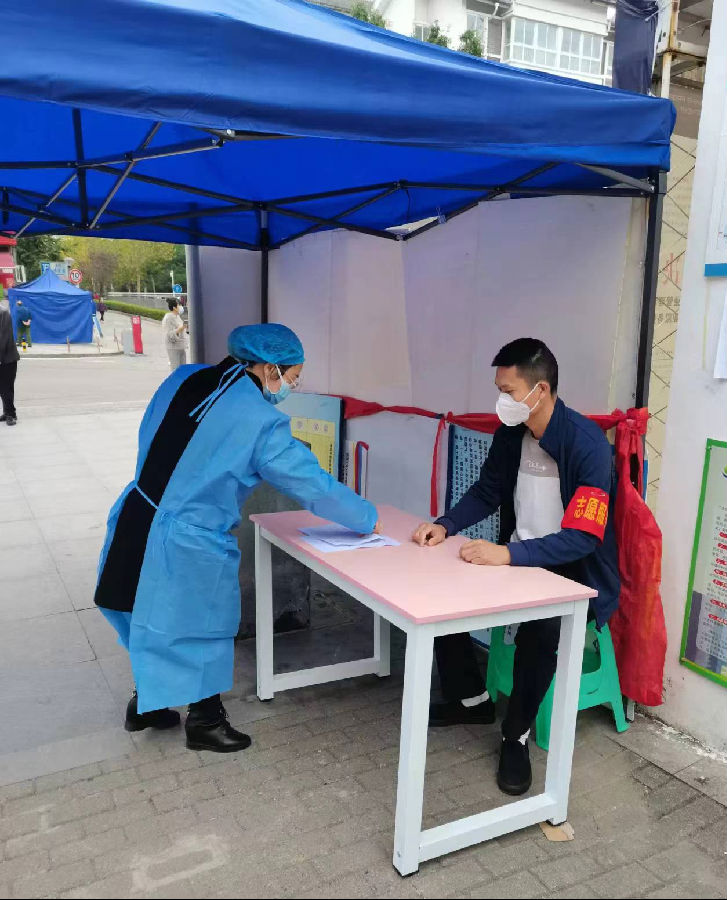 東城公交龍盛經(jīng)營部蔡忠茂、周磊,擔(dān)任秩序維護(hù)員,提醒居民規(guī)范佩戴口罩、保持一米線距離,配合醫(yī)護(hù)人員完成核酸檢測。